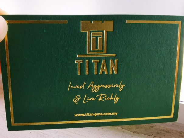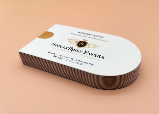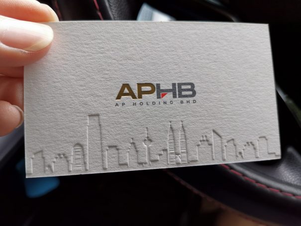 550gsm hard and solid thick card stock. Copper foil stamping with deboss at the front and raised ink effect on the contact side.
